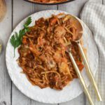 There are many different brands of gluten-free pasta that also are low in FODMAPs. I recommend you avoid varieties that incorporate chickpea, or other legumes, but I love Barilla and Jovial brands. For a recipe like this, that is going to be in a sauce, I prefer GF pastas that have some corn flour in them as they are less likely to get mushy (like Barilla).
