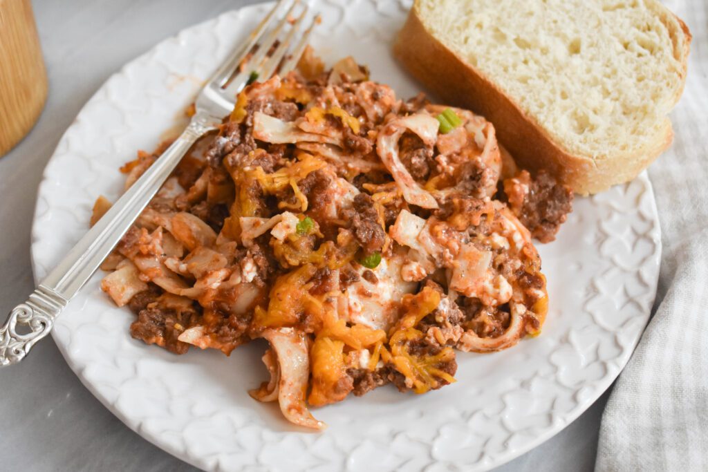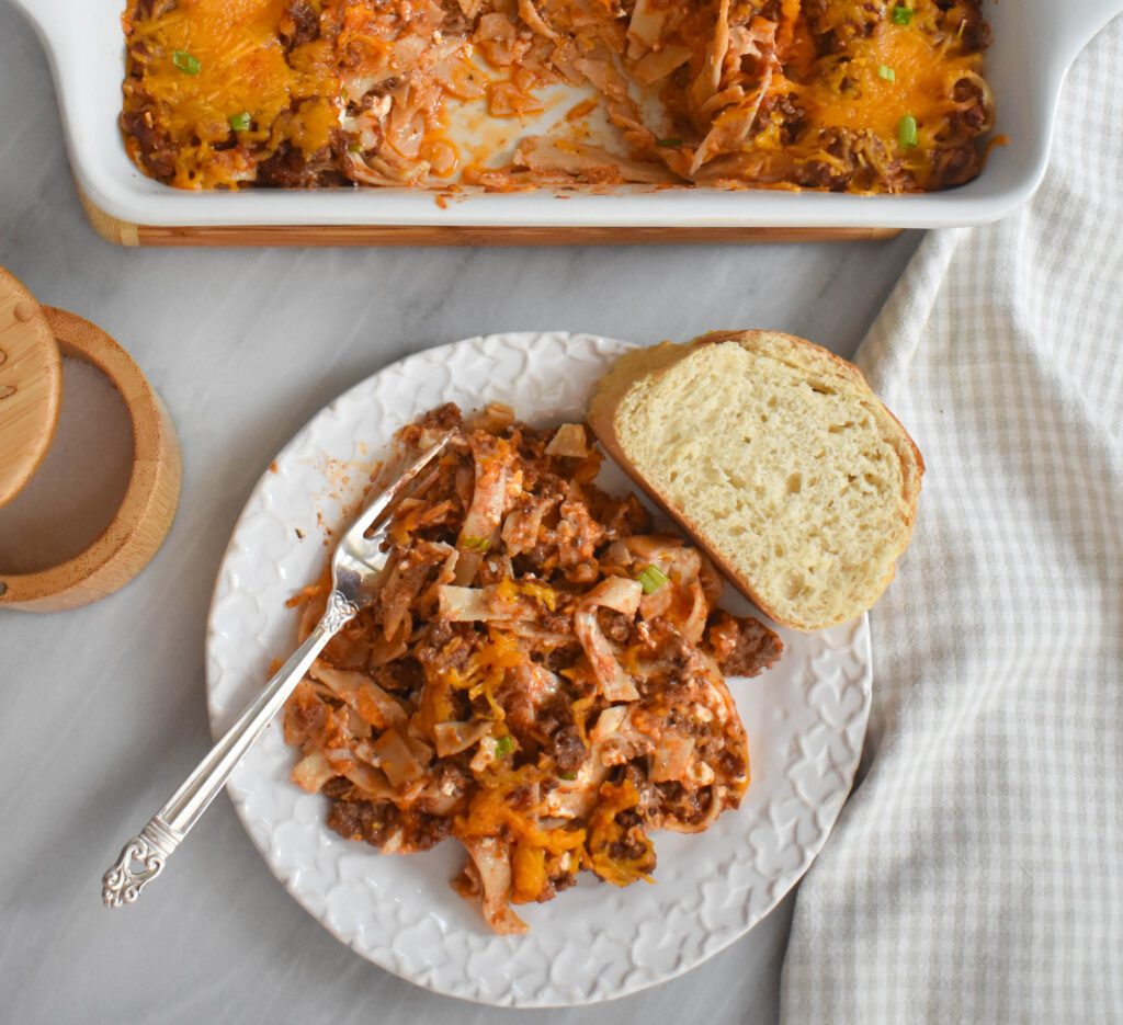 Low-FODMAP Sour Cream & Noodle Casserole. Beef, cheese, noodles, and tomato sauce, all together in 30 minutes! IBS-friendly and gluten-free.